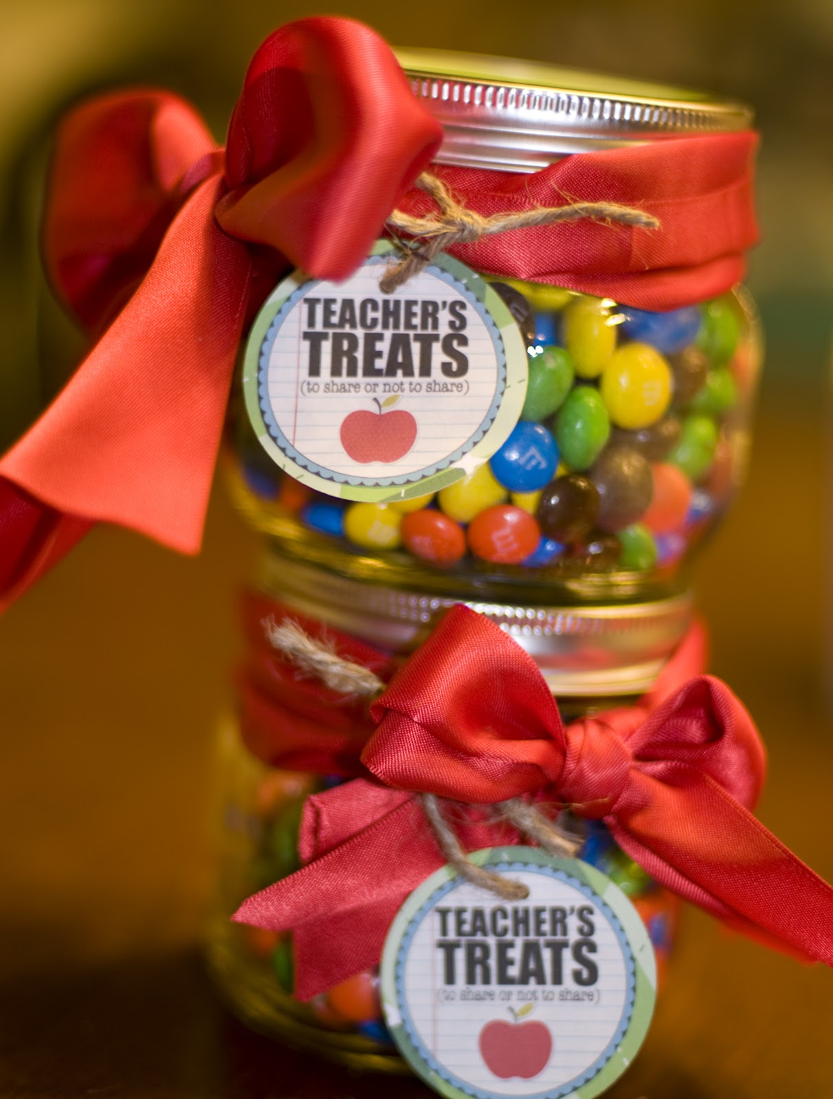 I put my 3inch circle punch on the lid (under the ring) but it kept slipping off, so I used my 3in scallop punch and it worked just fine; tied a cute bow on the front with the ribbon; attached the tag with tute and wrote on the back of the tag so my boys' teachers knew who their gifts came from. Super easy and maybe 5 minutes!